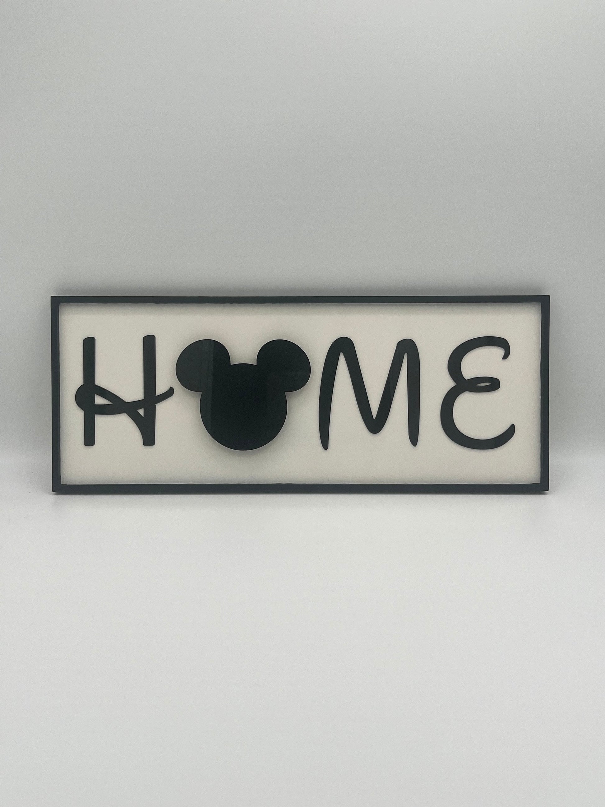 This custom piece features a 1/8" thick mdf board that is white background. We then do a 1/4" birch faux frame on the front. We then add 3D black acrylic letters to spell home. Instead of an "O" we feature a different mouse head for every season and mood! Each head is stuck on with heavy duty velcro so it is not going anywhere =)