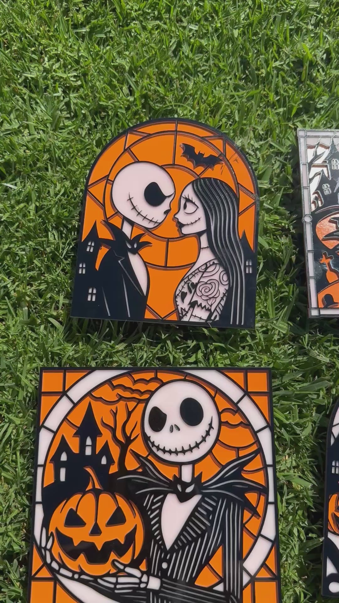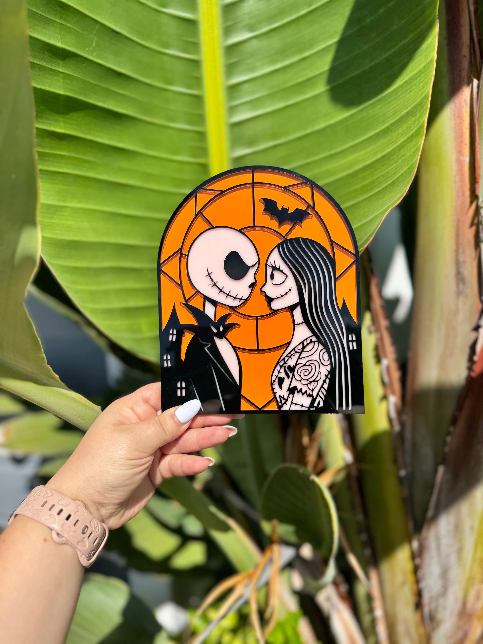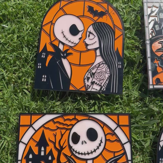 Bring the Pumpkin King's charm to your Halloween décor with this spooktacular set of 4 Jack Skellington Acrylic Signs! Inspired by The Nightmare Before Christmas, each piece showcases a hauntingly beautiful stained-glass style design featuring Jack (and Sally!) in iconic Halloween scenes.