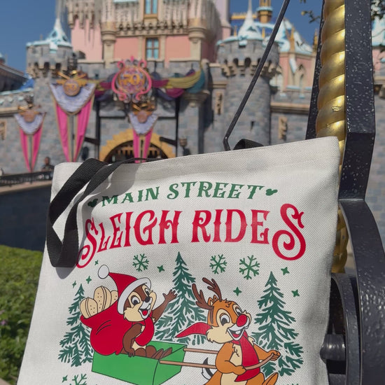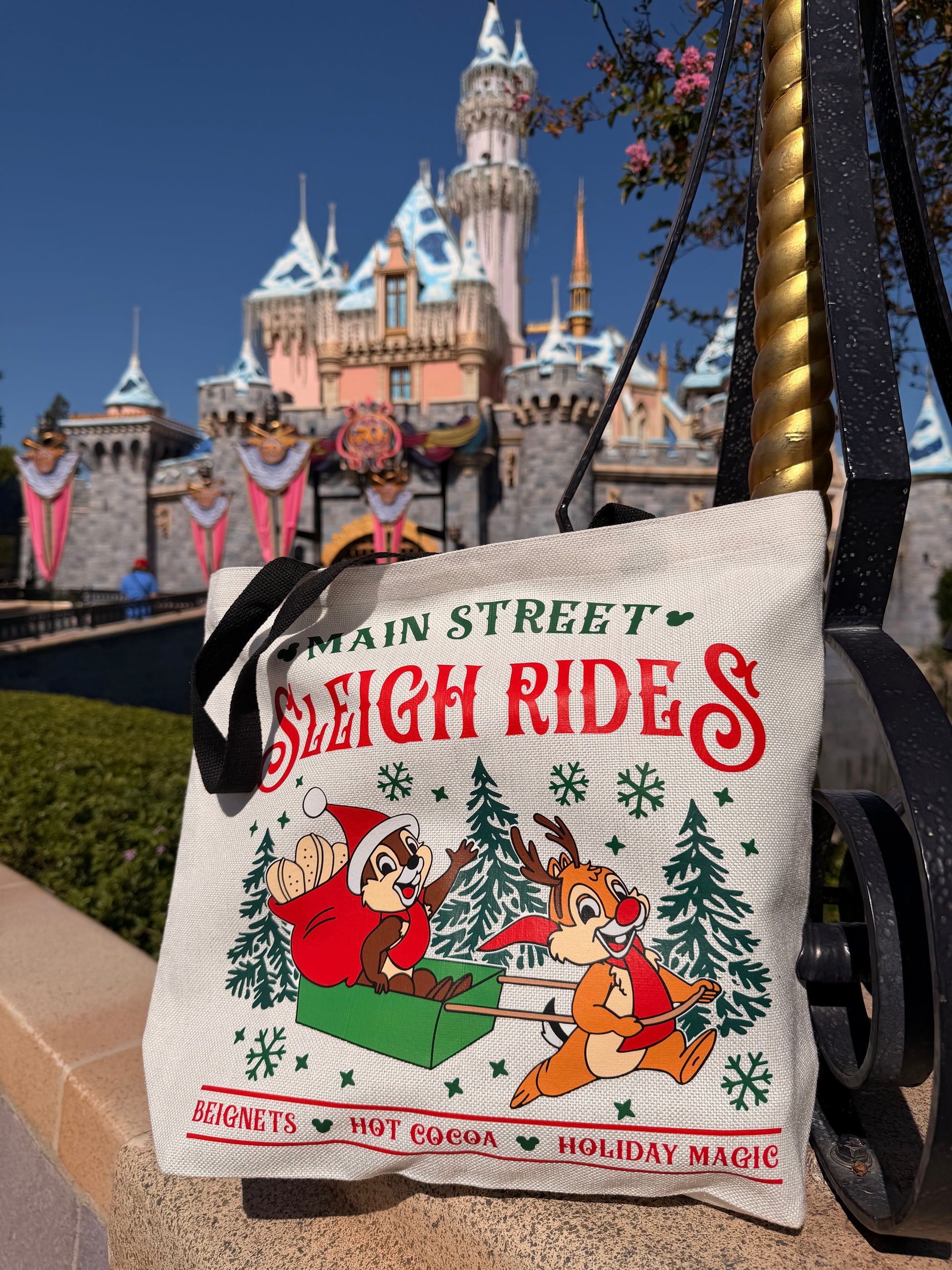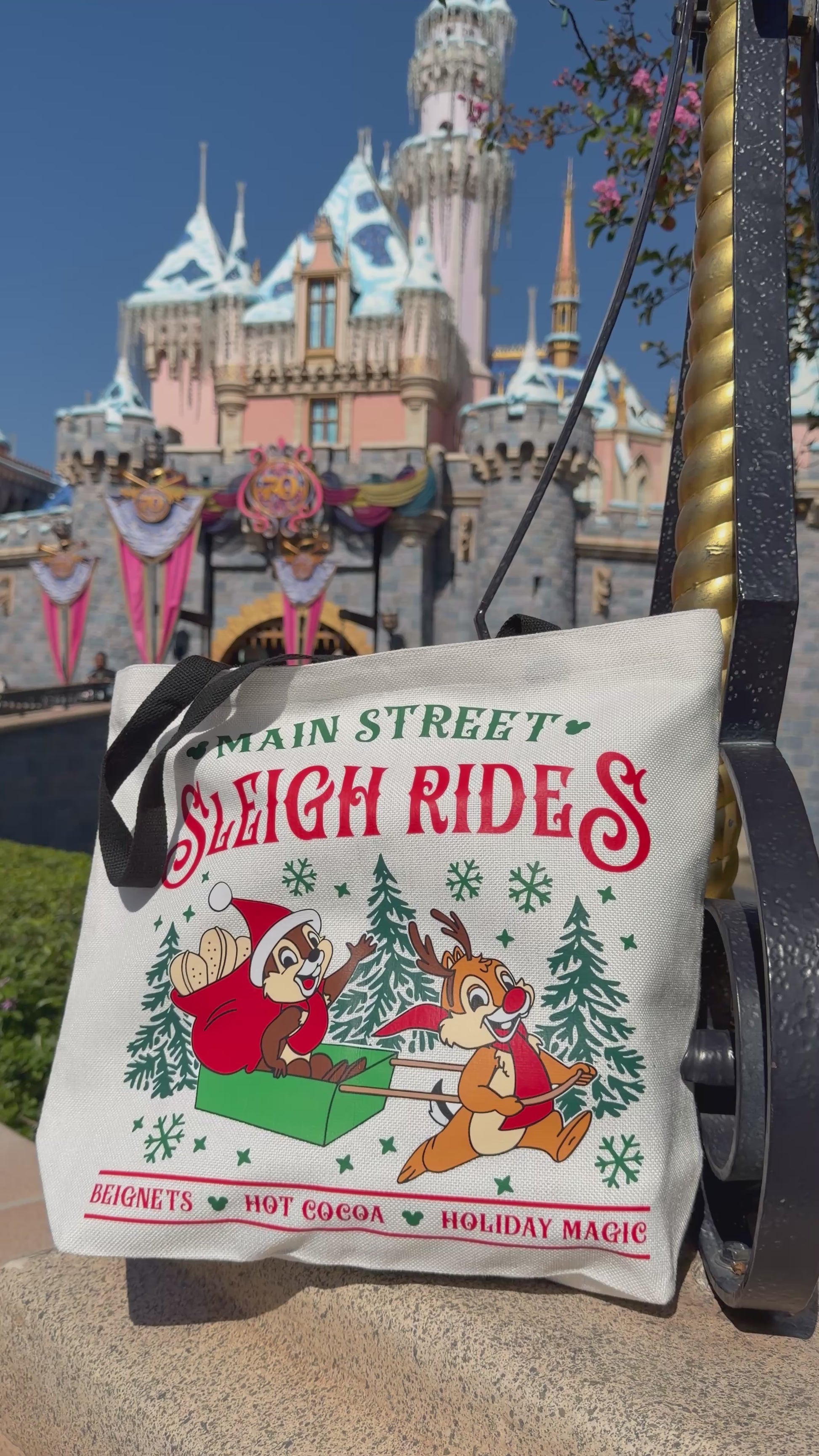 Celebrate the season of cocoa, beignets, and holiday magic with our Main Street Sleigh Rides Tote! Featuring an adorable vintage-style design of Chip & Dale delivering cheer, this tote is perfect for every merry outing.