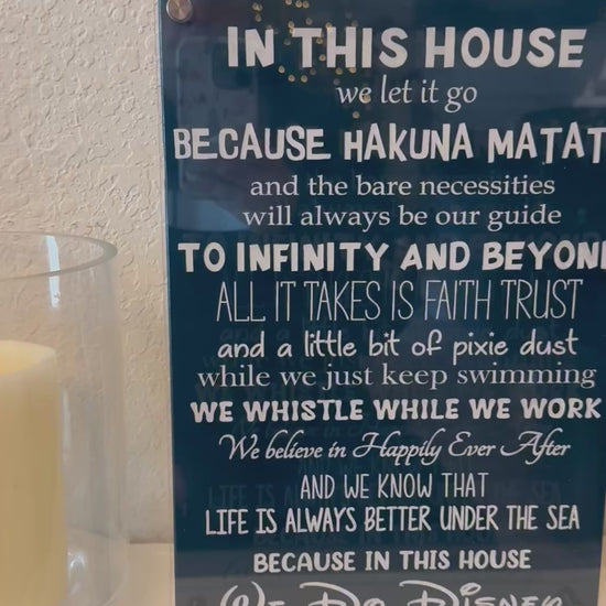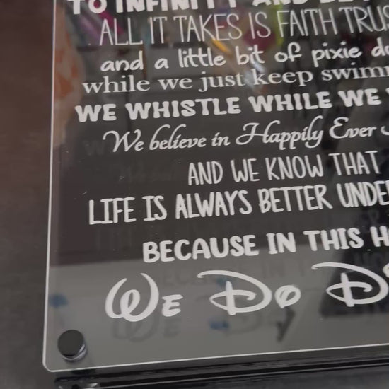 Add a touch of magic to any space with our We Do Disney engraved acrylic sign. Made from premium clear acrylic and professionally laser-engraved, each sign showcases beloved Disney-inspired sayings that bring joy, nostalgia, and a little extra pixie dust into your home. Backing is wood.