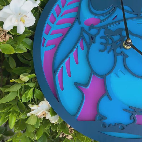 Each layer is painted in vivid tropical blues and pinks, creating a dimensional, eye-catching effect that makes Stitch pop right off the wall. Whether you're a Disney lover, a Lilo & Stitch fan, or just someone who appreciates unique home decor, this clock is sure to add charm and character to any room.