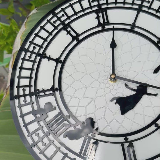 Let your imagination soar with our “Second Star to the Right” wall clock. This enchanting piece captures the spirit of Peter Pan with silhouetted characters flying across a Roman numeral clock face, surrounded by a delicate floral-engraved center.