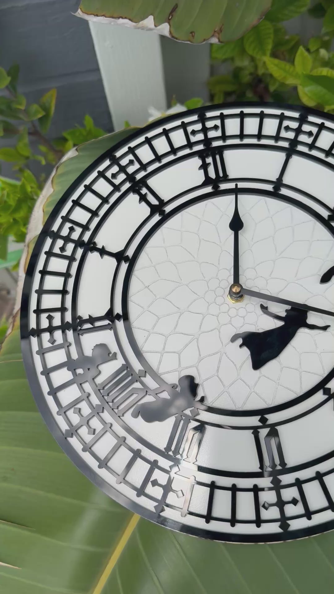 Let your imagination soar with our “Second Star to the Right” wall clock. This enchanting piece captures the spirit of Peter Pan with silhouetted characters flying across a Roman numeral clock face, surrounded by a delicate floral-engraved center.
